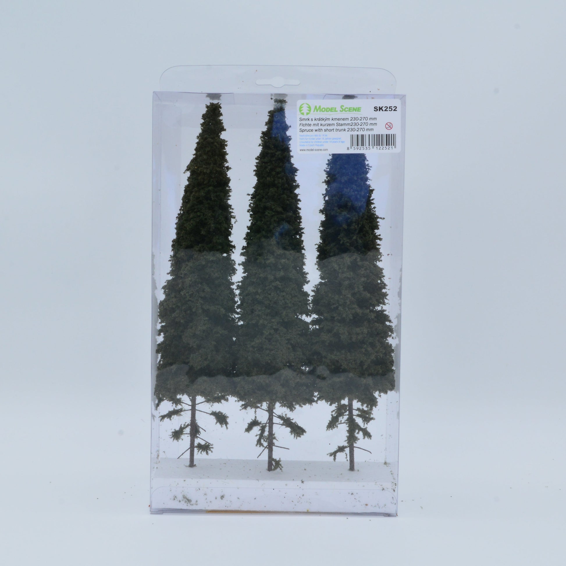 Die Variante Fichte mit kurzem Stamm besitzt einen kürzeren, kräftigen Stamm und erreicht eine Höhe von 230–270 mm. Durch die hochwertige Verarbeitung und die natürliche Form fügen sich die Bäume perfekt in jede Szene ein.